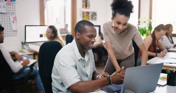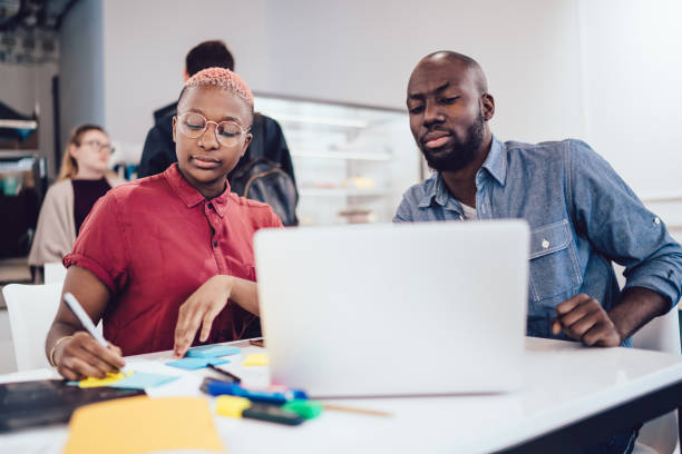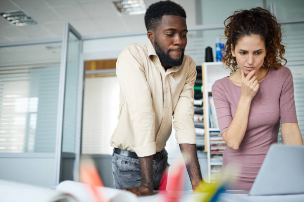 Portrait of young African businessman using laptop with female colleague while working in office, copy space