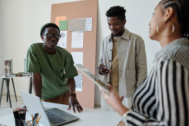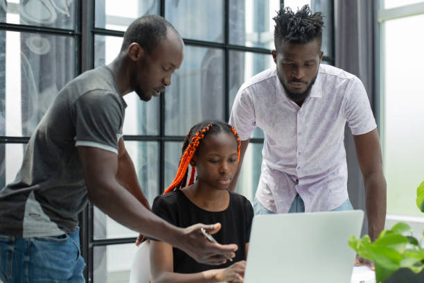 Confident black teammates sitting at table with laptop while man surfing Internet and woman taking notes on blurred background with diverse coworkers